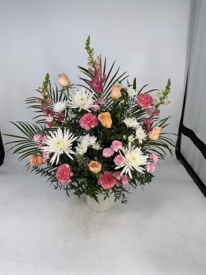 Well, the sprig on the left looks short, wilted and dying. Takes away from the whole arrangement. Could you please replace that sprig to one equal to the other two tall ones?? Also, it is sympathy but would like a little pleasant/happy color added like small blooms of pink scattered… flowers to represent…sympathy/blue Alzheimer's/purple female&love/pink… Thank you in advance. I will call to follow up at 9:00.