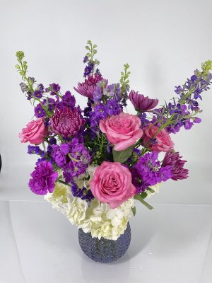This is the loveliest "February Amethyst" arrangement for a birthday, or any occasion. The flowers are large and vibrant, beautiful complementary shades and hues of purple, with a wonderful scent that fills the room. Very satisfied with this gift of flowers!