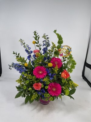 A beautiful flower layout. I really appreciate the picture before it's sent off. An animal item was not available, however, they made it right by telling me what they had in stock and everything worked out. I love the professionalism and beauty of this company.
