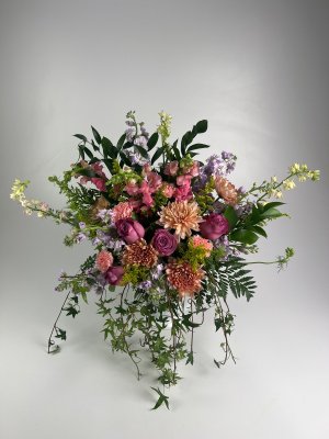 The flower arrangements and wreath were the perfect decorations for my daughter's wedding shower. The flowers reflected her chosen colors and accented the round tables beautifully with just a soft hint of pleasant smells. The wreath highlighted the cake. The Bride to Be was super pleased and is taking them home to enjoy their still freshness! Karins was so responsive to our needs, did such a beautiful job. And providing a photo ahead helped us visualize the creation!