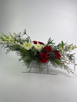 A lovely presentation of roses and chrysanthemum's in my sleigh! Arrived at the time I wanted as well. A top notch florist who delivers and listens to your requests. Thank you Karin's florist for adding to our party's success!