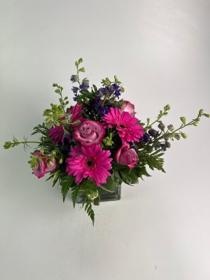 Pretty arrangement. The one I saw today was similar and discussed with the very helpful designer, also had blue and yellow flowers. Very bright and cheerful. Arrangement is to lift the recipient's spirit. Not the traditional Valentine's Day bouquet. Karen always delights with beautiful work Thankd