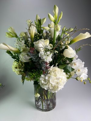 We were very surprise at the beautiful arrangement. I always use Karin's for flowers, and appreciate good service. The cost is something that surprised us. I know things are more expensive today, but we were still happy to see how beautiful it was. Thank you! Judy