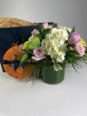 The flower arrangements and wreath were the perfect decorations for my daughter's wedding shower. The flowers reflected her chosen colors and accented the round tables beautifully with just a soft hint of pleasant smells. The wreath highlighted the cake. The Bride to Be was super pleased and is taking them home to enjoy their still freshness! Karins was so responsive to our needs, did such a beautiful job. And providing a photo ahead helped us visualize the creation!