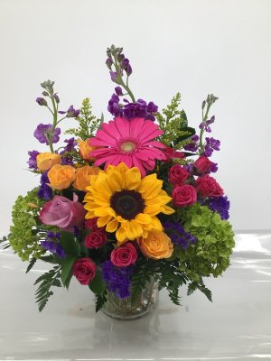 Recipient was so very pleased with your arrangement. Such color, and so many flowers! Having a photo and follow-up once arrangement was delivered was much appreciated. Thank you.