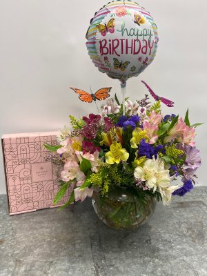 She loved the beautiful flower arrangement with the butterflies. Made her day!