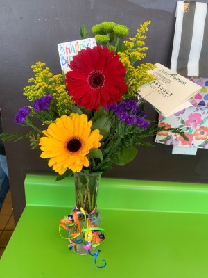 This centerpiece is stunning! The flowers are vibrant, fresh, and arranged beautifully. I'm completely in love with it. Thank you so much!