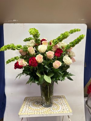 I really don't like the long green flower and would prefer lilies or other roses that are balanced symmetrically with the arrangement