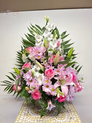 I like the color palette of the flowers, although seems like there's a lot of mums & daisies. Would have preferred more roses or other flowers. It is a big, beautiful arrangement.